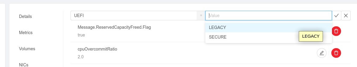So how do we go about it? In 2 simple steps:On (RH)EL: guest.nvram.template.secure=/usr/share/edk2/ovmf/OVMF_VARS.secboot.fd guest.nvram.template.legacy=/usr/share/edk2/ovmf/OVMF_VARS.fd guest.nvram.path=/var/lib/libvirt/qemu/nvram/ guest.loader.secure=/usr/share/edk2/ovmf/OVMF_CODE.secboot.fd guest.loader.legacy=/usr/share/edk2/ovmf/OVMF_CODE.cc.fd On Ubuntu/Debian: guest.nvram.template.secure=/usr/share/OVMF/OVMF_VARS_4M.ms.fd guest.nvram.template.legacy=/usr/share/OVMF/OVMF_VARS_4M.fd guest.nvram.path=/var/lib/libvirt/qemu/nvram/ guest.loader.secure=/usr/share/OVMF/OVMF_CODE_4M.secboot.fd guest.loader.legacy=/usr/share/OVMF/OVMF_CODE_4M.fdStep 2 - Enable UEFI boot in the VM settings in the CloudStack UI or API. The VM needs to be stopped for this to be possible. Both LEGACY and SECURE are valid options. The latter is if you need "secure boot".